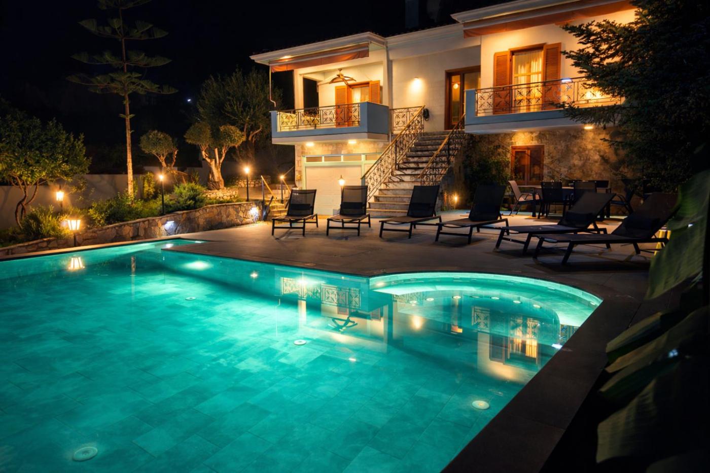 Three-Bedroom House. Guests will have a special experience as this holiday home offers a infinity pool, a hot tub and a fireplace. Featuring a private entrance, this air-conditioned holiday home consists of 1 living room, 3 separate bedrooms and 2 bathrooms with a bath and a hairdryer. The holiday homes kitchen, which features a refrigerator and kitchenware, is available for cooking and storing food. The spacious holiday home provides a coffee machine, a seating area, a dining area as well as a terrace with sea views. The unit offers 5 beds.